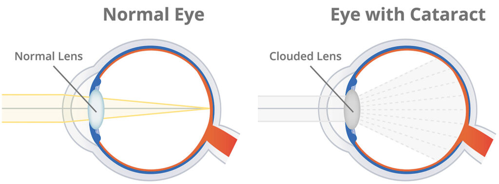 Cataracts occur when the lens of the eye becomes clouded. It is often a result of the natural aging process, as proteins on the lens slowly break down and form clumps, making it harder to see.